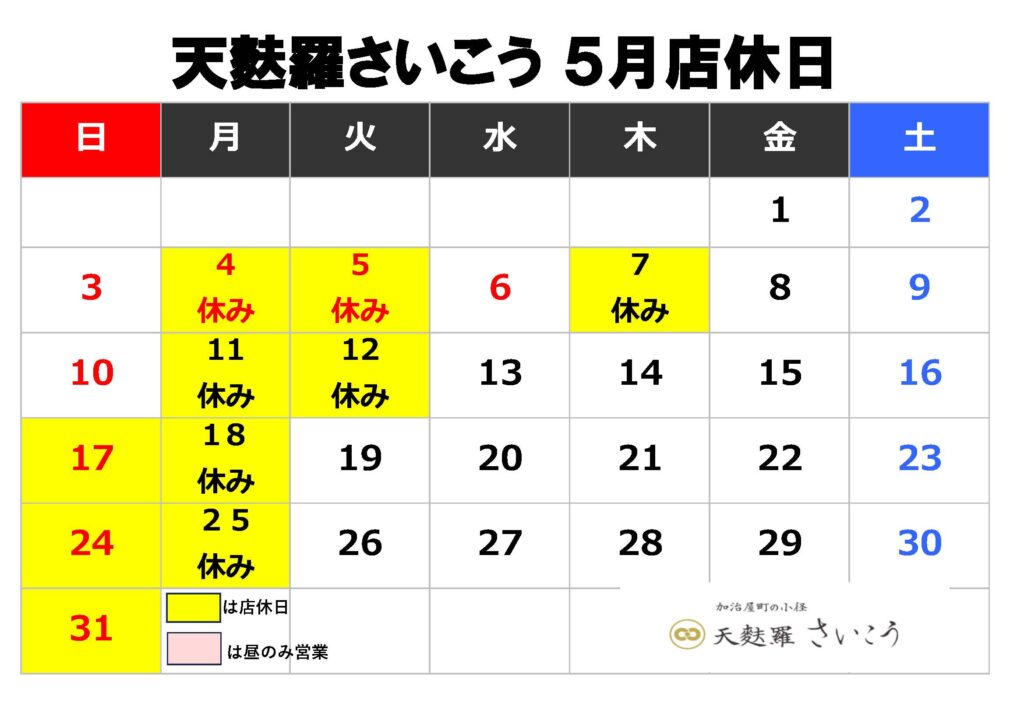 5月の定休日につきまして、誠に勝手ながら変則的なお休みとさせていただきます。